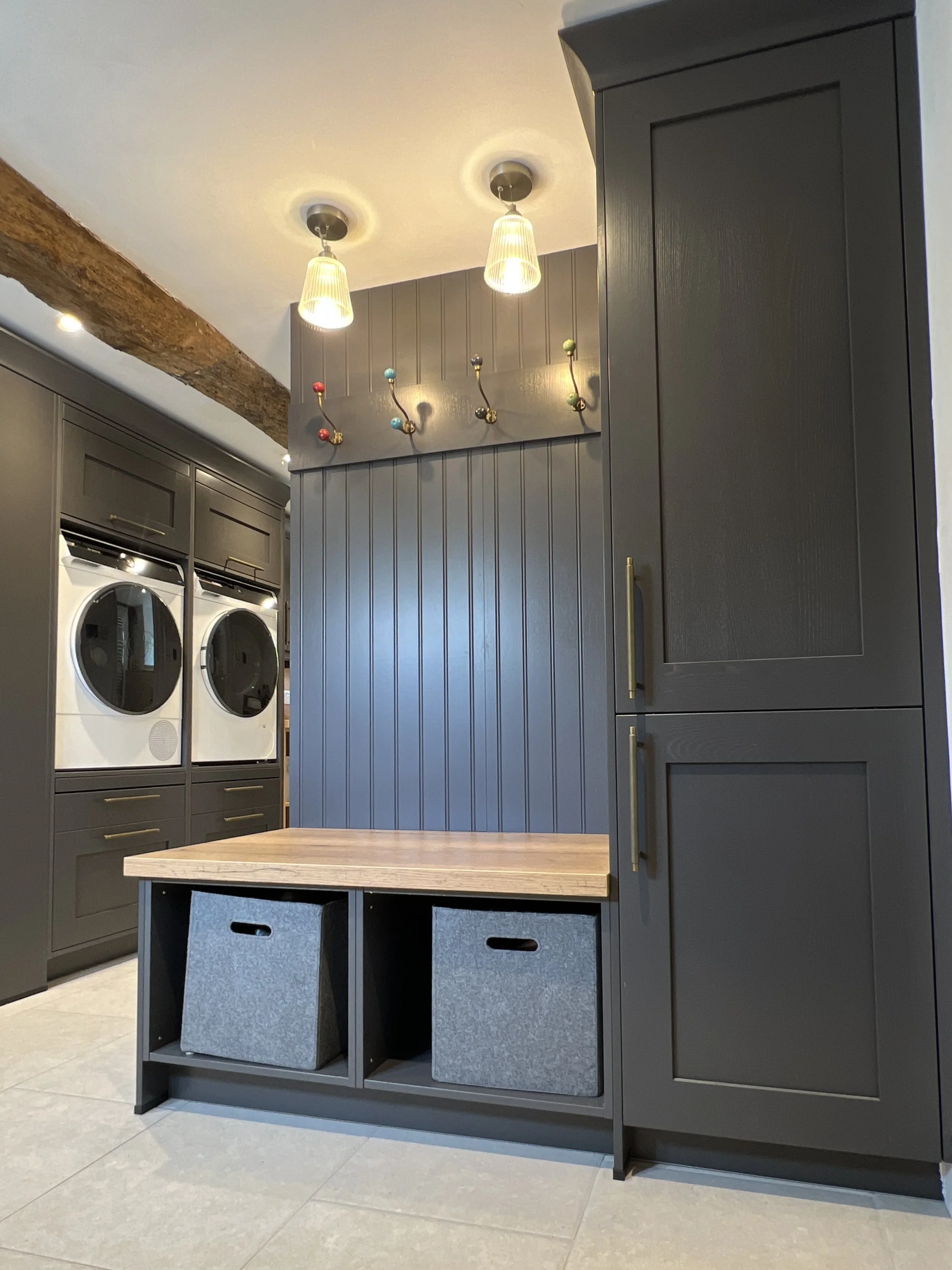 Practical spaces deserve just as much thought as showpieces, and this design proves it. Ash Graphite cabinetry with open shelving and full-height laundry units keeps everything organised. To soften the look and add warmth, we introduced characterful wall panelling, which gives a nod to timeless, country-style charm.